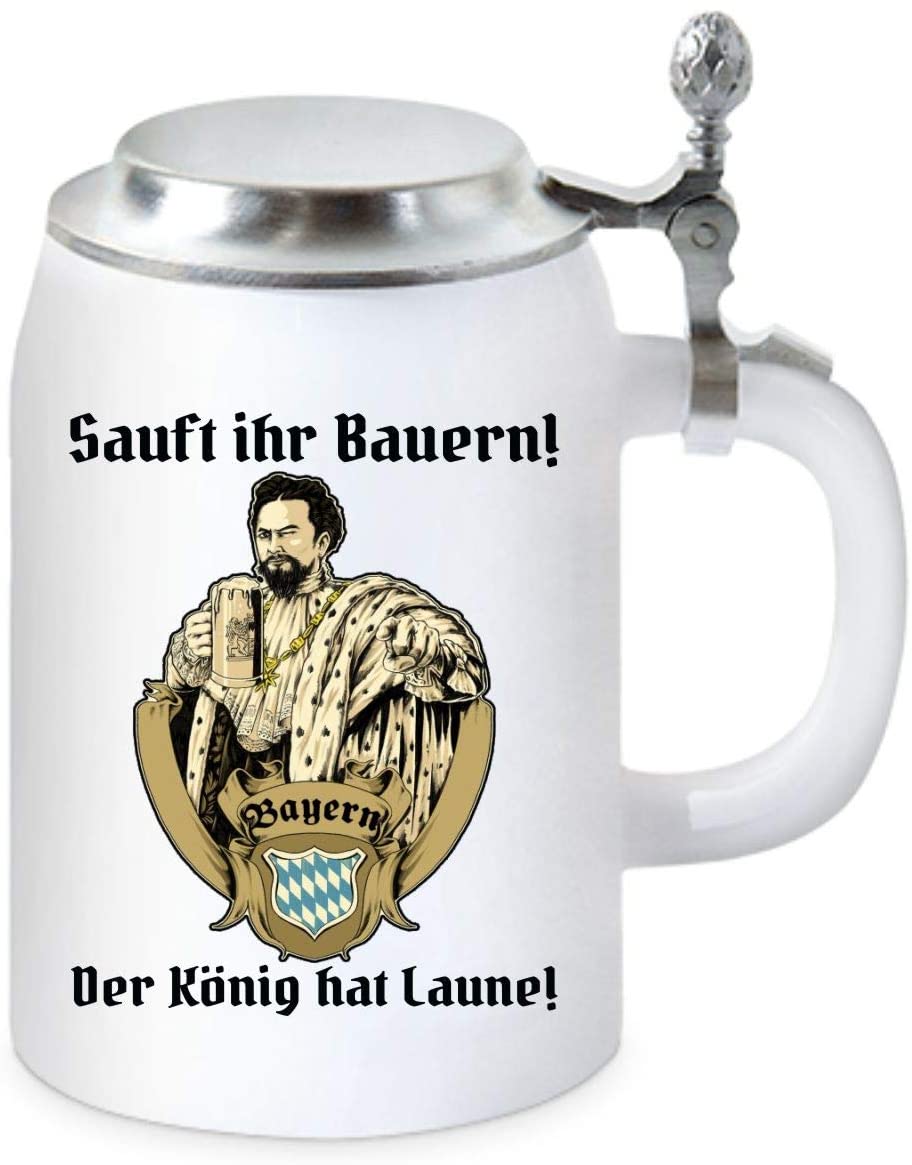 Bierkrug 0,5L Keramik mit Flachdeckel - Sauft Ihr Bauern der König hat Laune