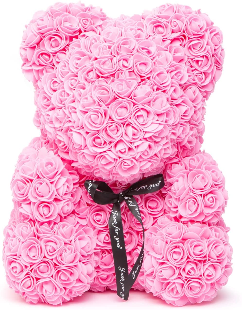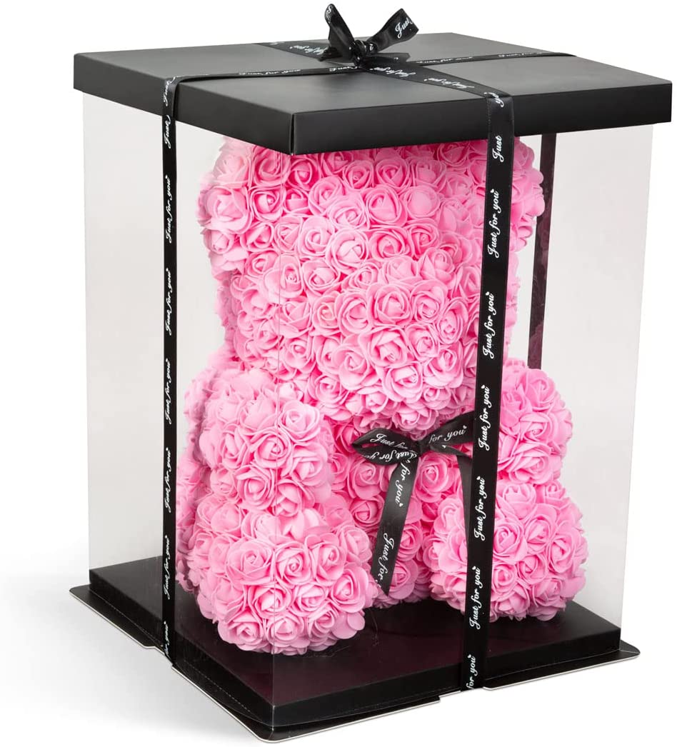 Blumenbär Rosenbären mit Schleife inklusive Geschenkbox Valentinstag Muttertag Geburtstag Jahrestag Bär aus Rosen Teddybär Blütenbär in Rosa