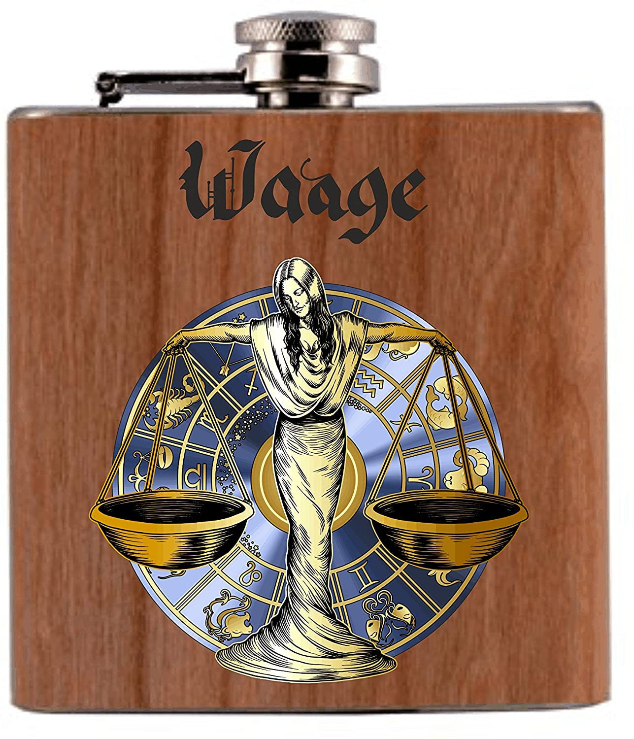 Flachmann Bedruckt anstelle Gravur - Flachmann mit Echtholzfurnier ummantelt - für den Horoskop Sternzeichen Zodic Fan Sternzeichen Waage