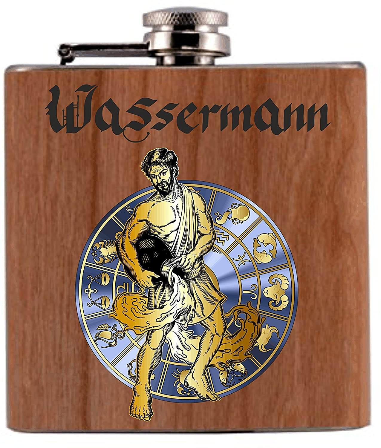 Flachmann Bedruckt anstelle Gravur - mit Echtholzfurnier ummantelt - für den Horoskop Fan - Sternzeichenscheibe Wassermann