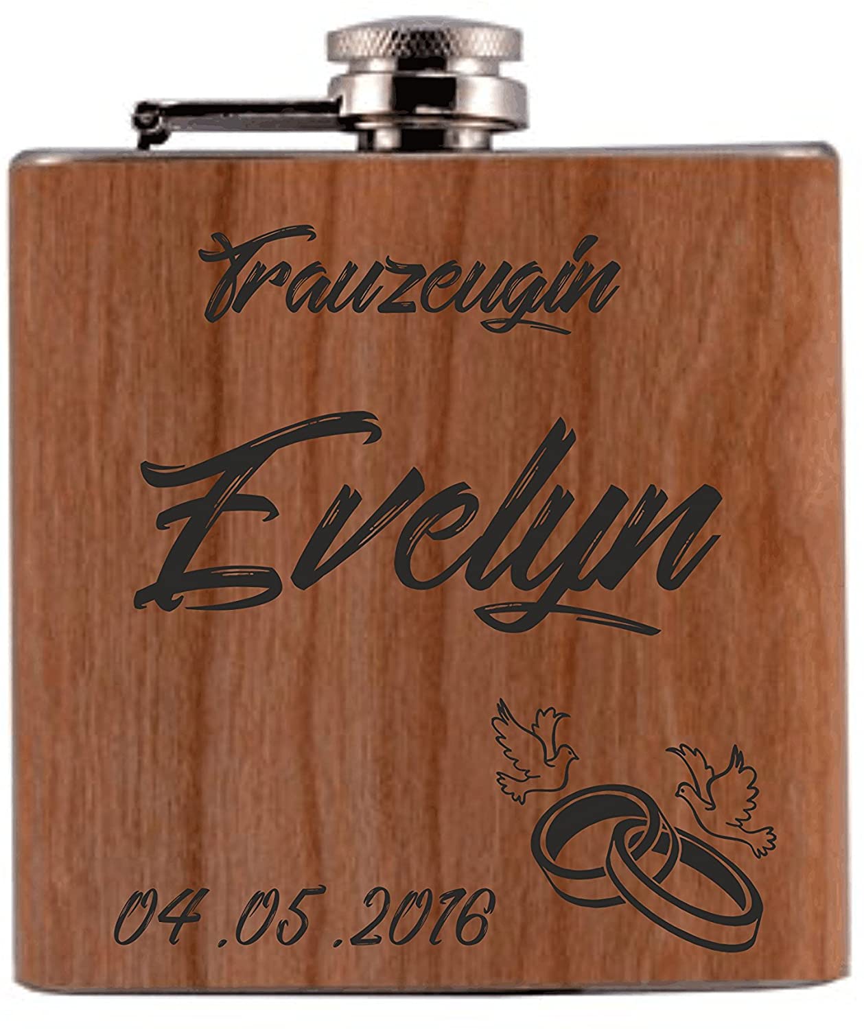 Flachmann Bedruckt anstelle Gravur - mit Echtholzfurnier ummantelt - Trauzeugin [Wunschname] und [Wunsch-Datum] und mit einen Tauben/Ring Motiv