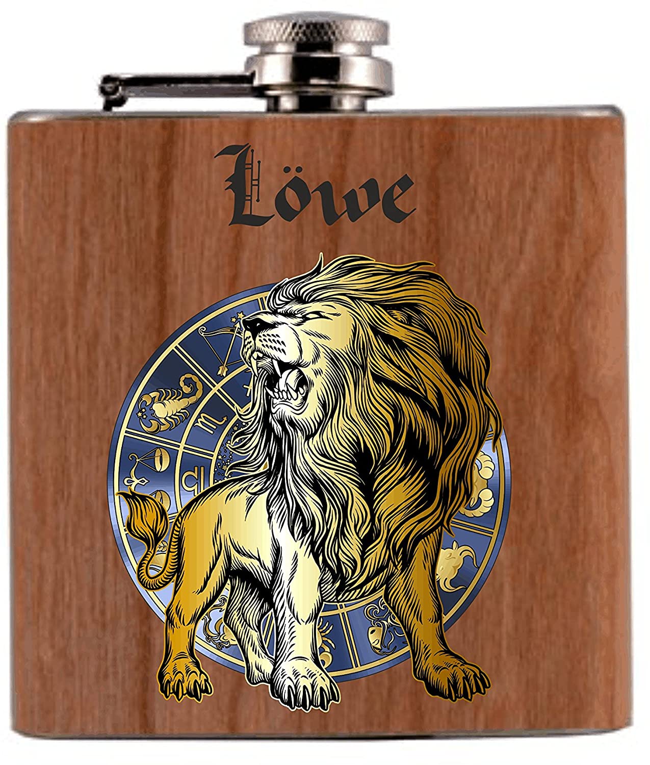 Flachmann Metall/Holz Bedruckt anstelle Gravur - mit Echtholzfurnier ummantelt - Horoskop Sternzeichen Sternzeichenscheibe Motiv Löwe