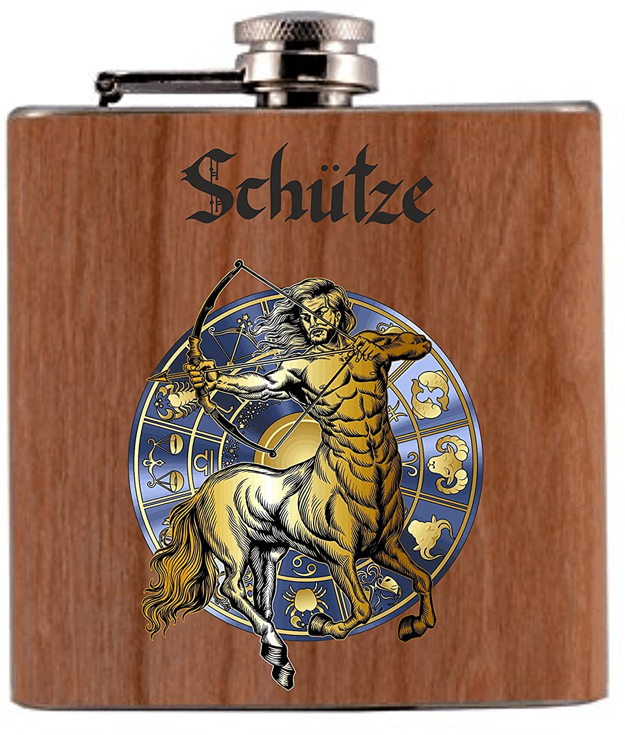 Flachmann Metall/Holz Bedruckt anstelle Gravur - mit Echtholzfurnier ummantelt - Horoskop Sternzeichen Sternzeichenscheibe Motiv Schütze