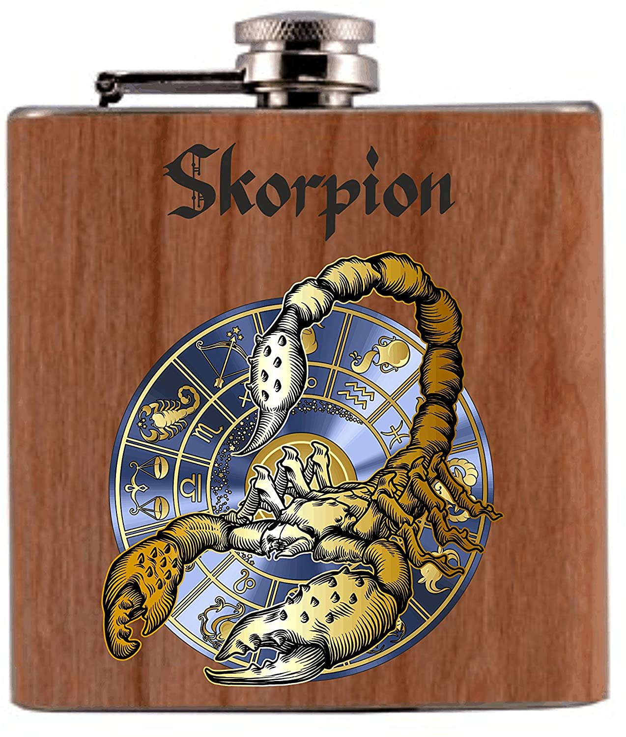 Flachmann Metall/Holz Bedruckt anstelle Gravur - mit Echtholzfurnier ummantelt - Horoskop Sternzeichen Sternzeichenscheibe Motiv Skorpion