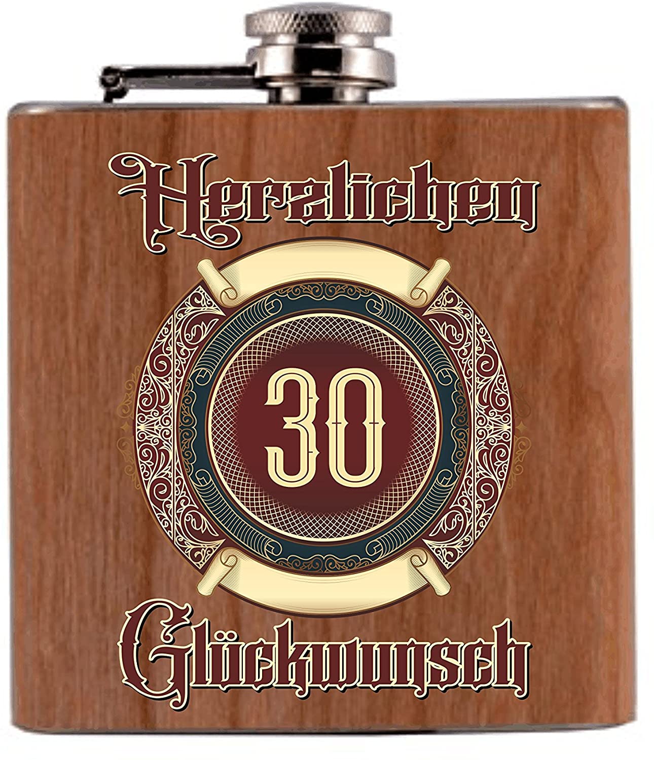 Flachmann Metall/Holz Bedruckt anstelle Gravur - mit Echtholzfurnier ummantelt - zum Geburtstag Herzlichen Glückwunsch mit Ornament 30