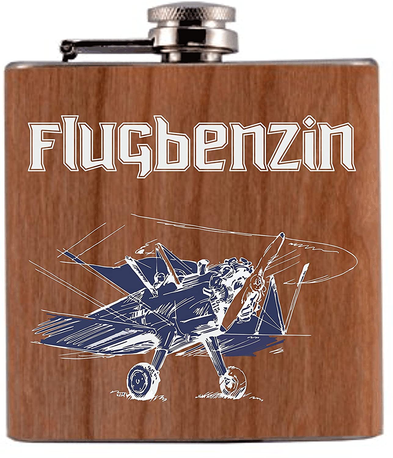 Flachmann Metall/Holz Bedruckt - mit Echtholzfurnier ummantelt - für Piloten Freizeit Flieger Motiv Flugzeug und Schriftzug Flugbenzin