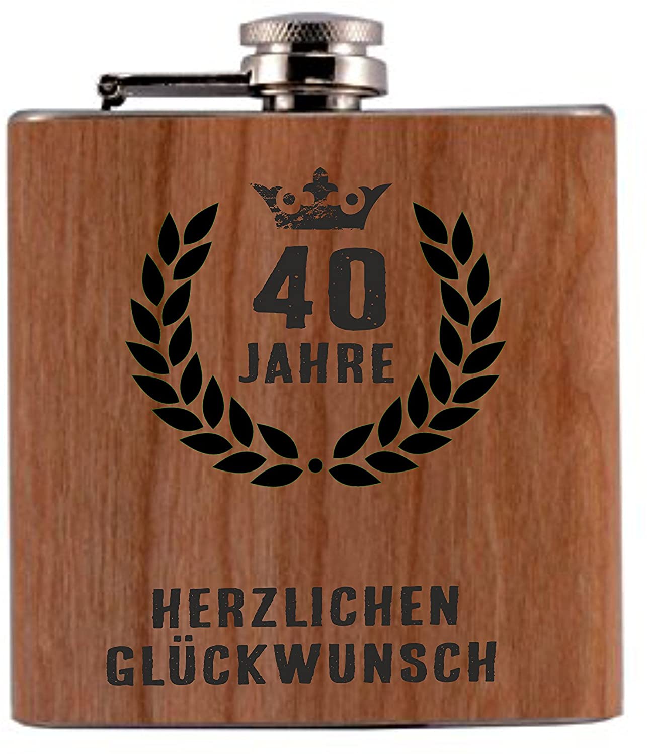 Flachmann Metall/Holz Bedruckt - mit Echtholzfurnier ummantelt - Geburtstag 40 Jahre Herzlichen Glückwunsch eingebettet in einen Ährenkranz mit Krone