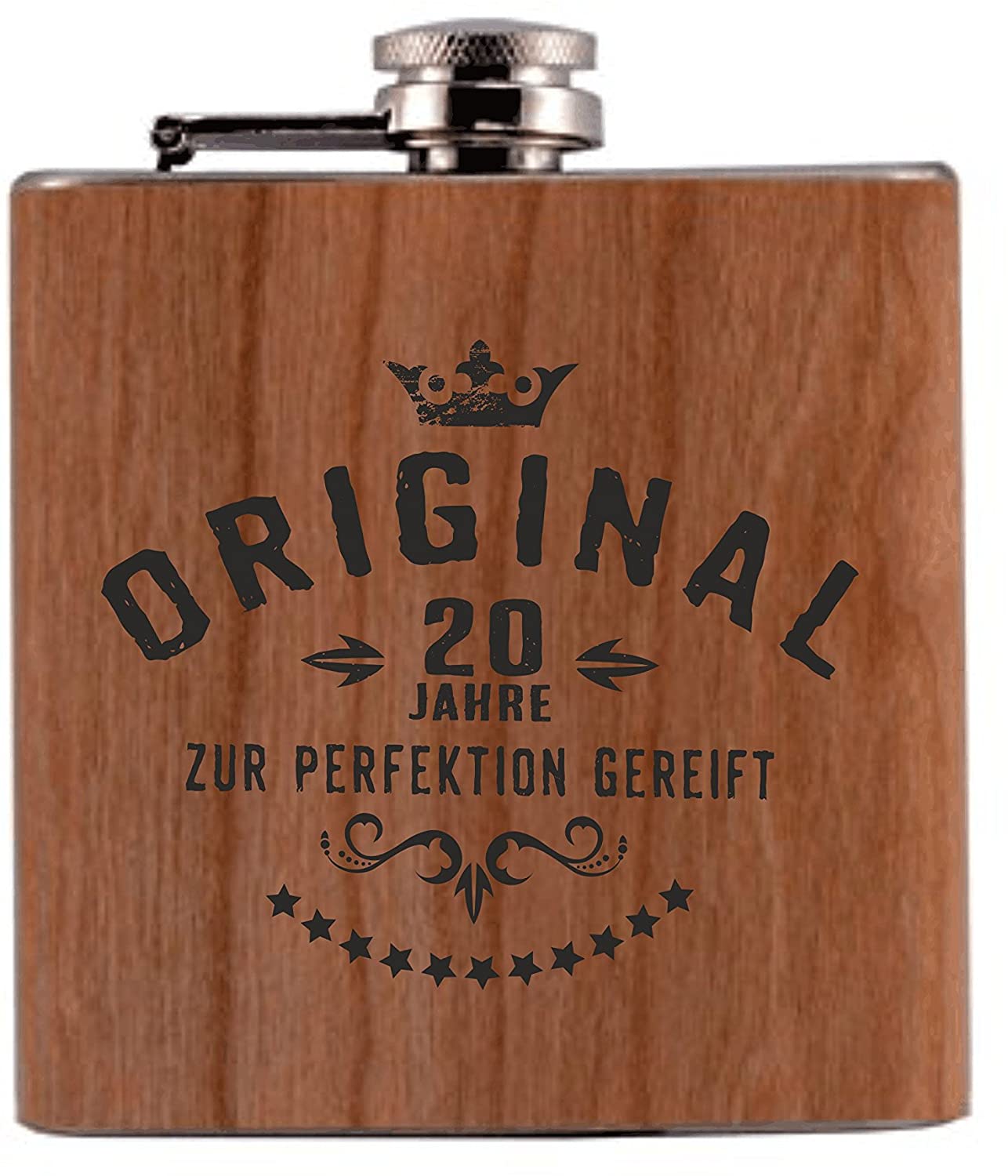 Flachmann Taschenflachmann Taschenflasche bedruckt - Echtholzfurnier ummantelt - hochwertiger Aufdruck "Original 20 Jahre - zur Perfektion gereift"