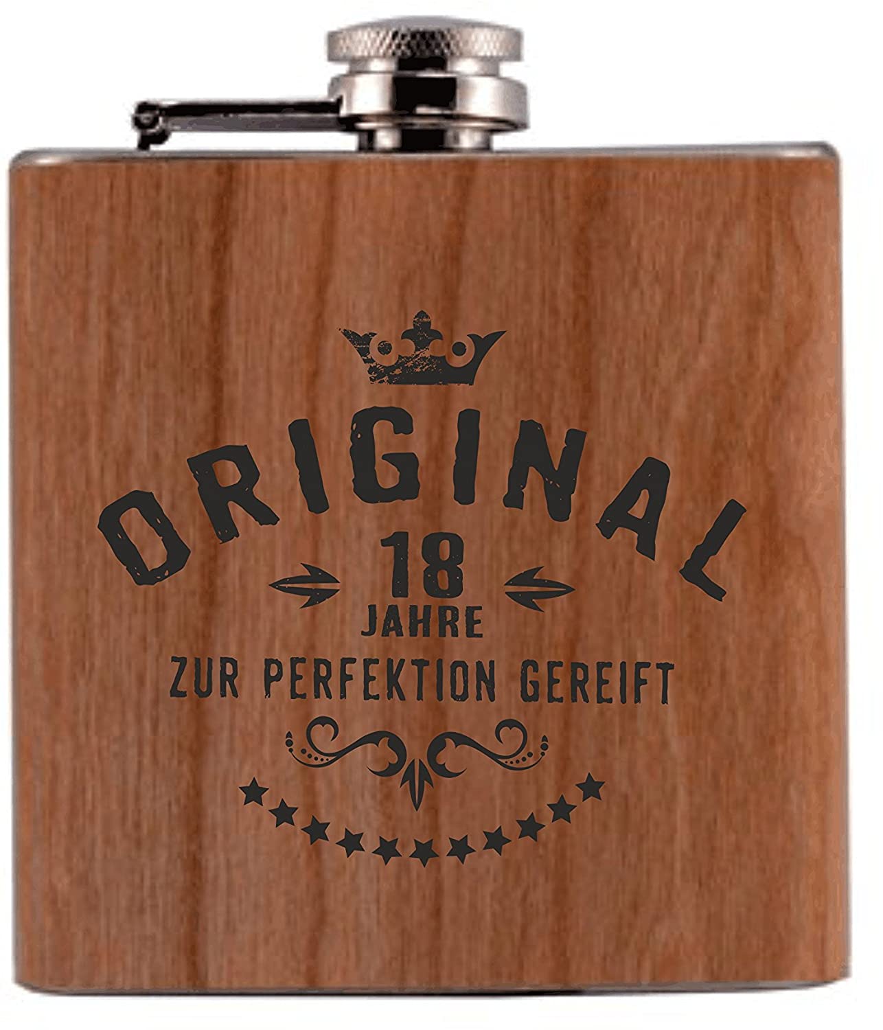 Flachmann bedruckt - Echtholzfurnier ummantelt - zum Geburtstag "Original 18 Jahre - zur Perfektion gereift"