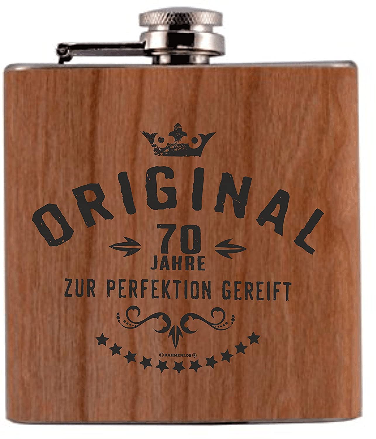 Flachmann Taschenflasche bedruckt - Echtholzfurnier ummantelt - zum Geburtstag mit hochwertigem Aufdruck "Original 70 Jahre - zur Perfektion gereift"