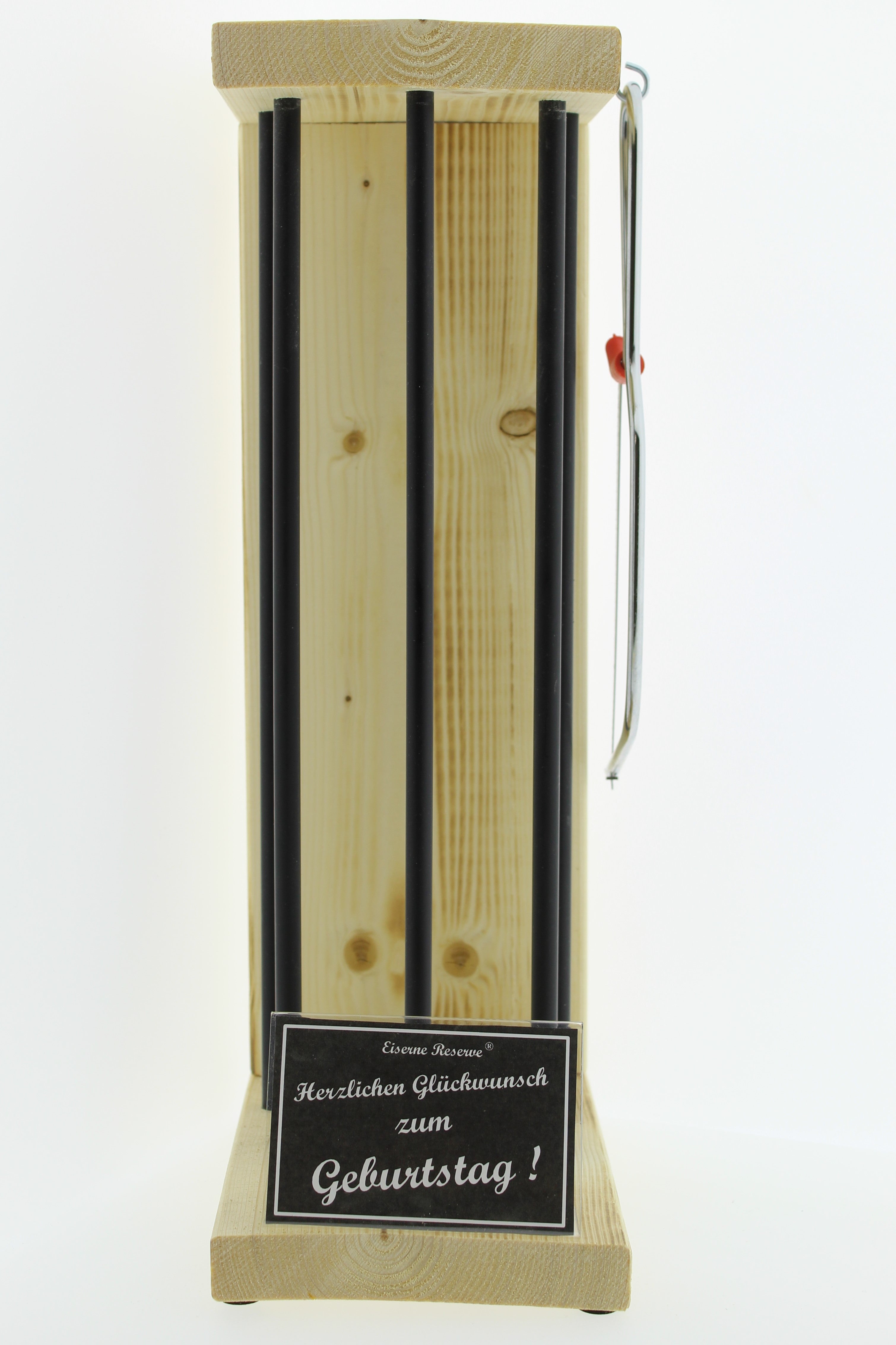 👀 Der Hingucker: Eiserne Reserve in Form einer Holzbox mit Stäben welche man Getränkeflaschen oder sonstigen Artikel befüllen kann. Im Lieferumfang enthalten sind auch vorgefertigten Kärtchen für das ausgewählte Motiv, welche in den dafür vorgesehenen Kartenhalter zu stecken sind.