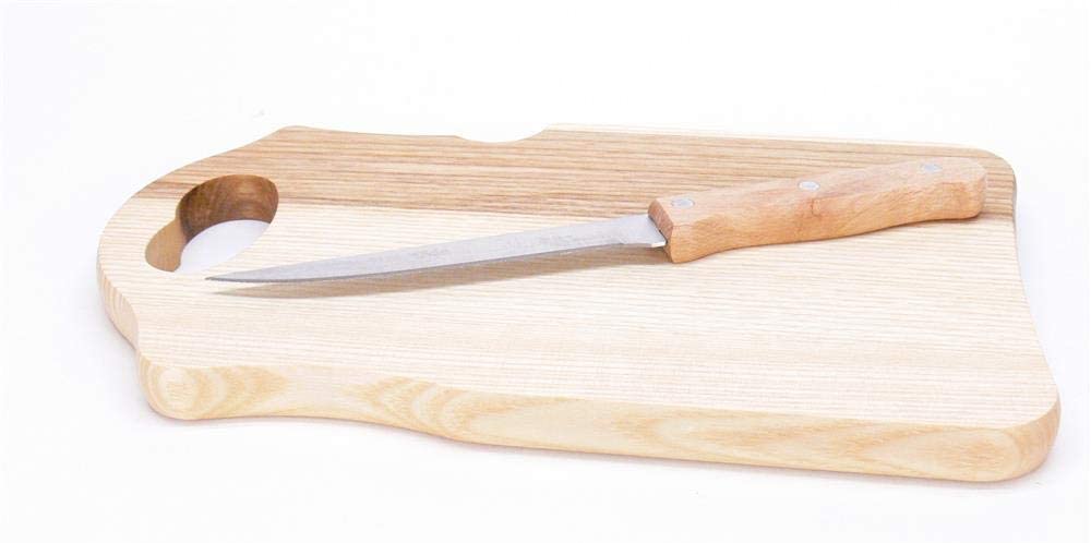 ✅ Graviertes Schneidbrett incl. 21cm Schneidmesser mit Wellenschliff welches im oberen Bereich des Brettes eingesteckt werden kann.