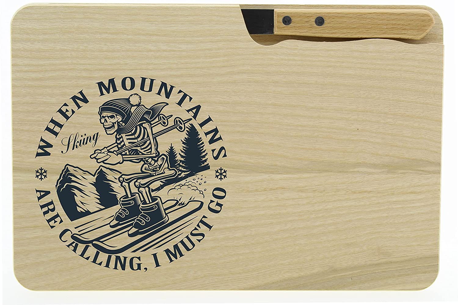 Schneidebrett mit Messer und Gravur, Brotzeitbrett Holz ESCHE, Motiv für den Alpinisten & Skifahrer - When the Mountain are calling, I must Go