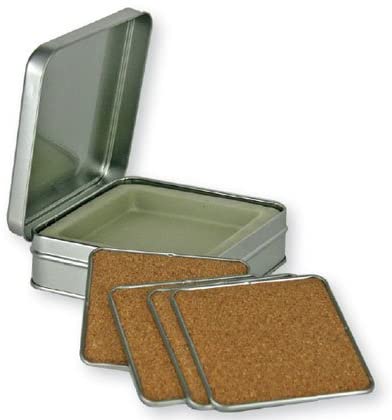 Dekorative Glasuntersetzer aus Metall/Kork-Kombination mit hochwertigem farbigen Aufdruck in Metallaufbewahrungsbox eingebettet in passender Schaumstoffform