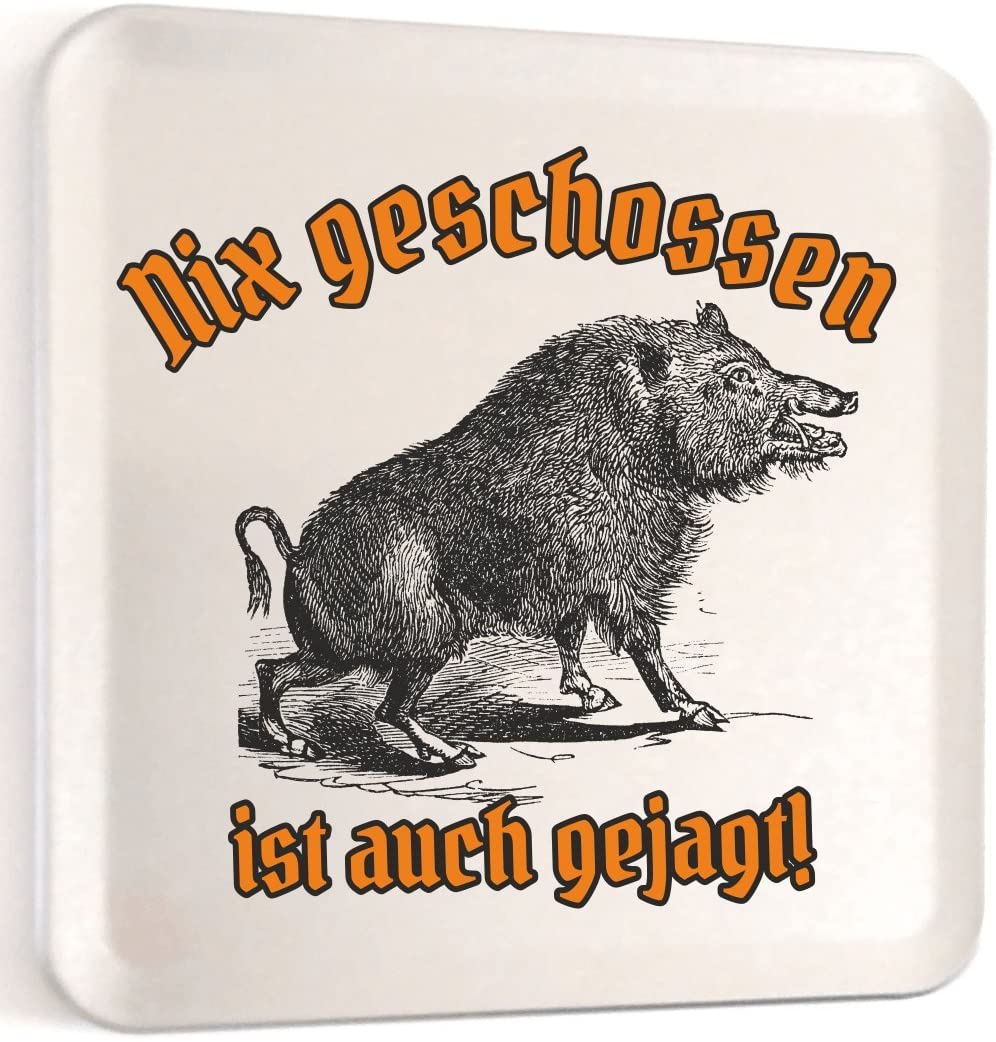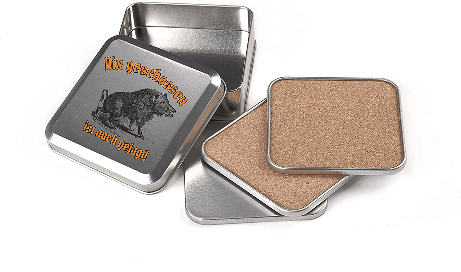 Untersetzer Bedruckt anstelle Gravur - aus Metall/Kork 9,5x9,5cm in Aufbewahrungsbox - Motiv Jäger Nix gschossen ist auch gejagt mit Wildsaumotiv